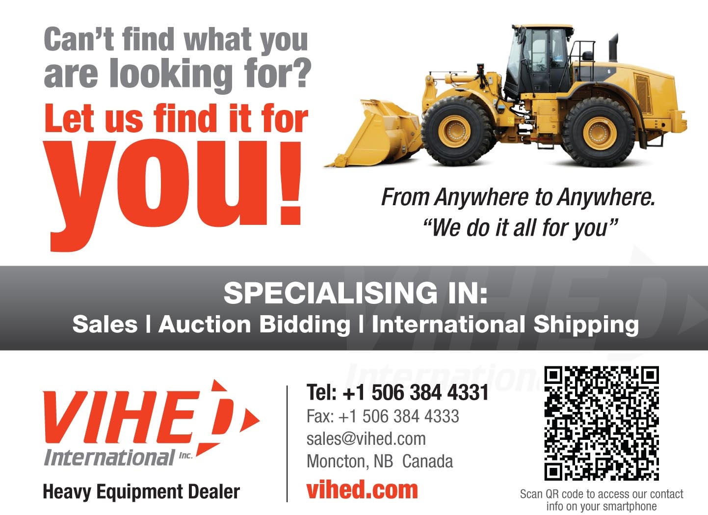Vihed International Inc. 500 St. George Street Moncton, NB Canada (506) 384-4331 Vihed International is a Heavy Equipment dealer company with the main goal of linking the buyers and the sellers of Machinery from around the world. We specialize in Sales, Auction Bidding and International Shipping. |