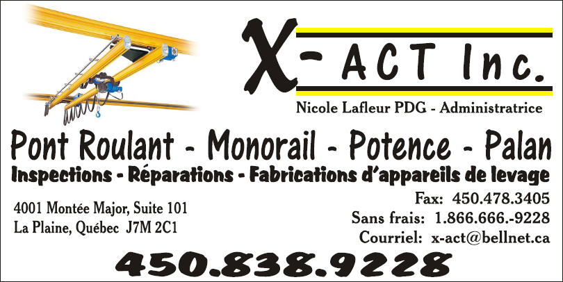X act le groupe inc 4001 Montee Major Terrebone, AB Canada (450) 838-9228 Entretien, Inspection et Reparation D`appareil de Levage |
